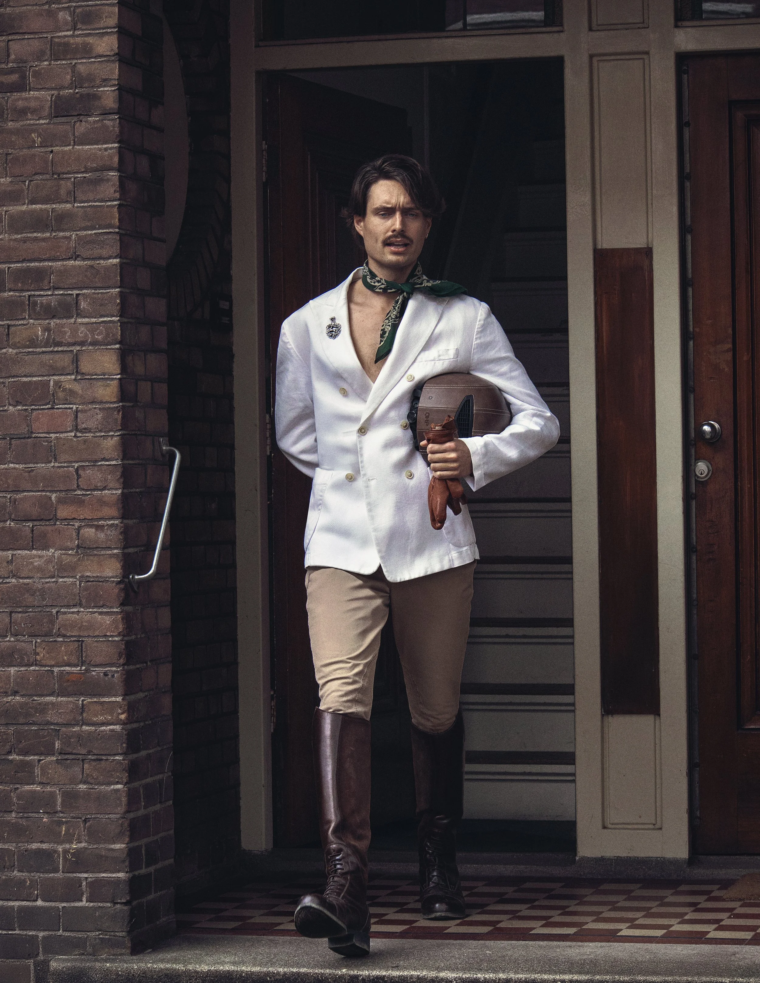 Previous Pages: MODEL WEARS SHIRT by Polo Ralph Lauren (worn throughout), TIE by The English Hatter (worn throughout), RINGS byVan Bruggen Juwelen (worn throughout), Current Page: MODEL WEARS JACKET by Jey Cole (worn throughout), Men Bandana by Stetson (worn throughout), Riding Breeches byHermès (worn throughout), Riding Boots byAriat (worn throughout), Helmet by QHP (worn throughout), Gloves byHestra (worn throughout), Brooch byantique silver (worn throughout), Next Page: MODEL WEARS HAT by Stetson (worn throughout), CARDIGAN by Vintage Yves Saint Laurent (worn throughout), Homme Shorts by Mr. Marvis (worn throughout), SOCKS by Burlington (worn throughout), SHOES by Church (worn throughout),